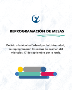 Informamos que, debido al cese de actividades previsto para el miércoles 17 de septiembre a partir de las 15:00 hs, en el marco de la Marcha Federal por la Universidad Pública, todas las mesas de examen programadas para la tarde de ese día fueron reprogramadas.